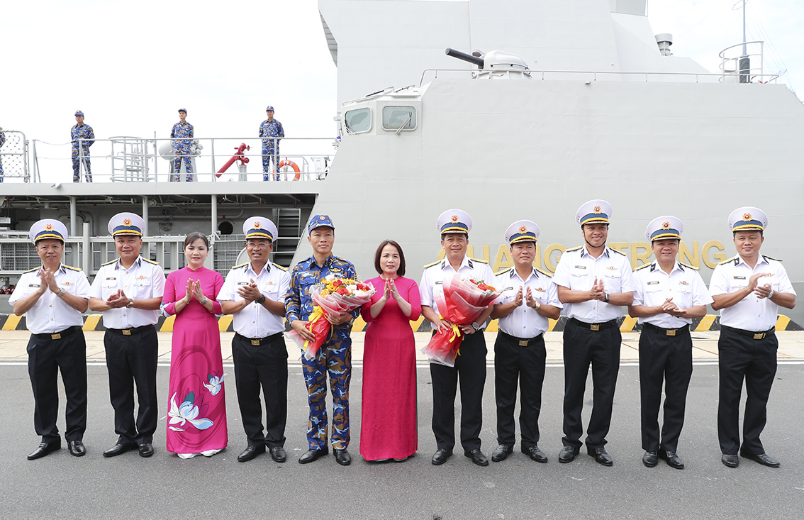 Đại tá Nguyễn Vĩnh Nam, Phó Tư lệnh Vùng 4 cùng cán bộ, thủy thủ Tàu 016-Quang Trung thực hiện nghi thức chào khi tàu cơ động qua lễ đài