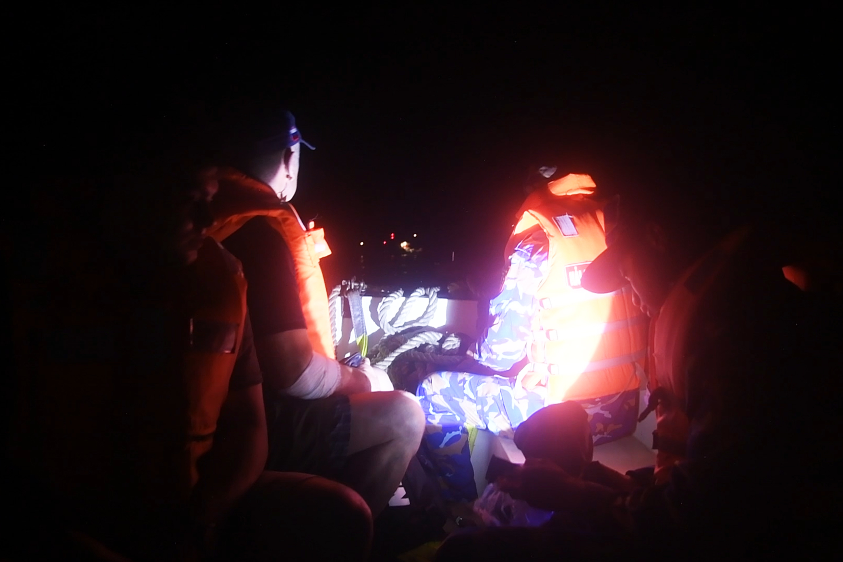 Xuồng của Tàu 471 tiếp cận tàu Pechenga đón bệnh nhân trong đêm