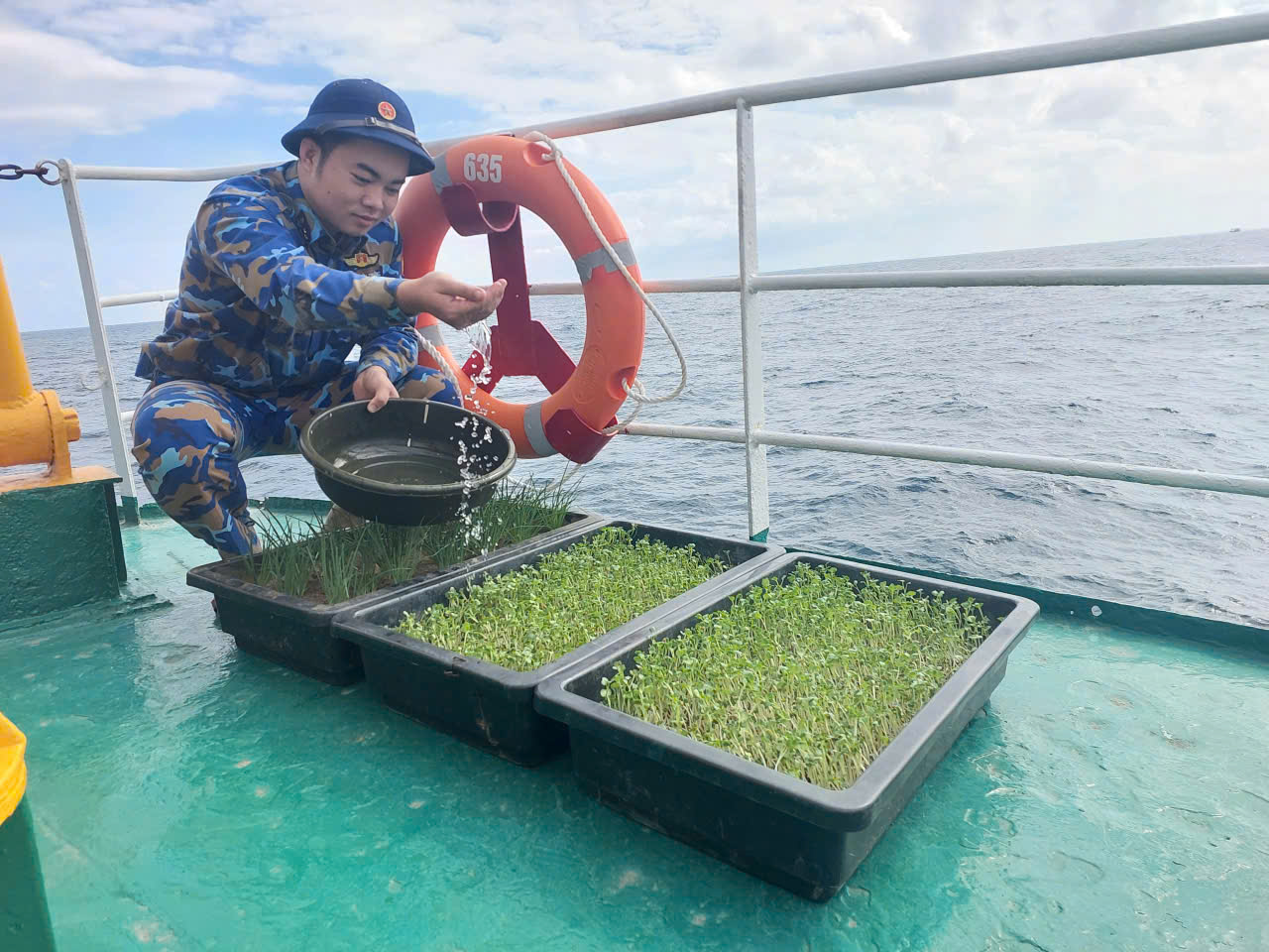 Tàu chủ động tăng gia sản xuất rau xanh ngay trên biển trồng rau ngắn ngày trên diện tích hạn chế, luân phiên thu hoạch, bổ sung dinh dưỡng cho bữa ăn, cải thiện đời sống và sức khỏe bộ đội.