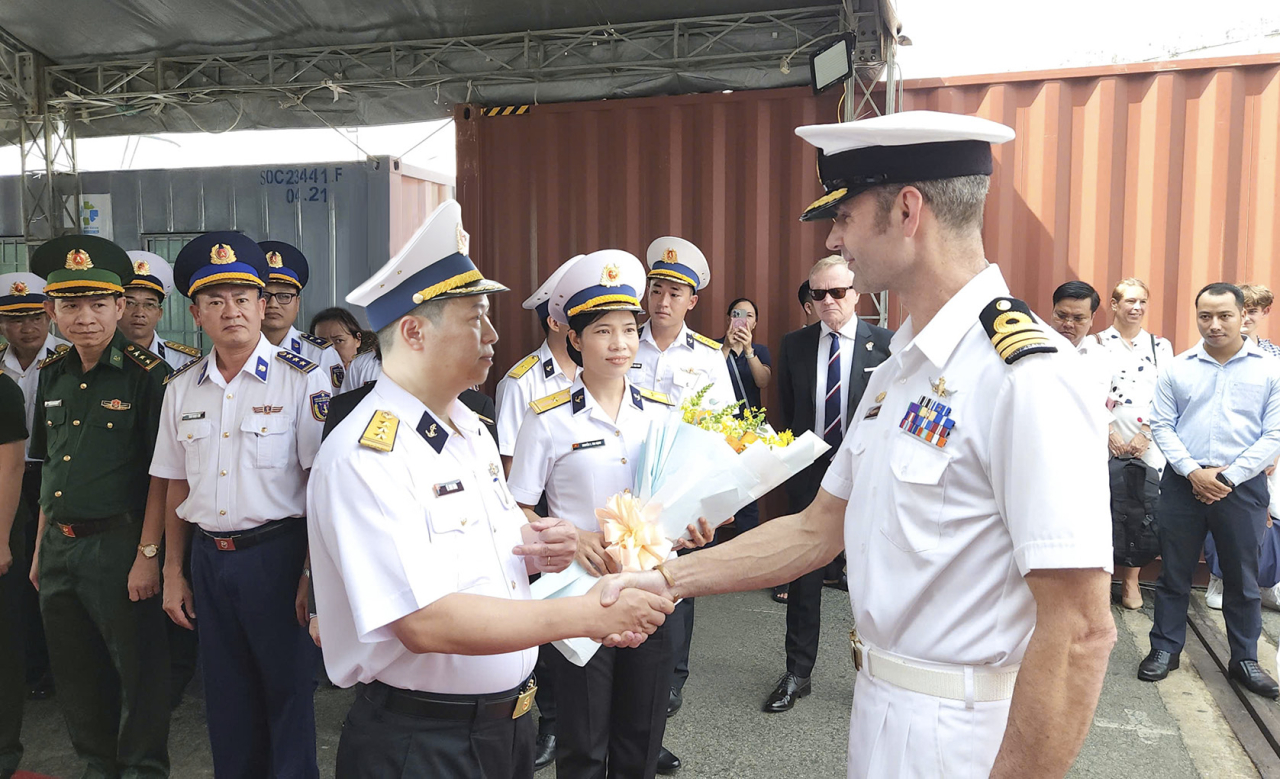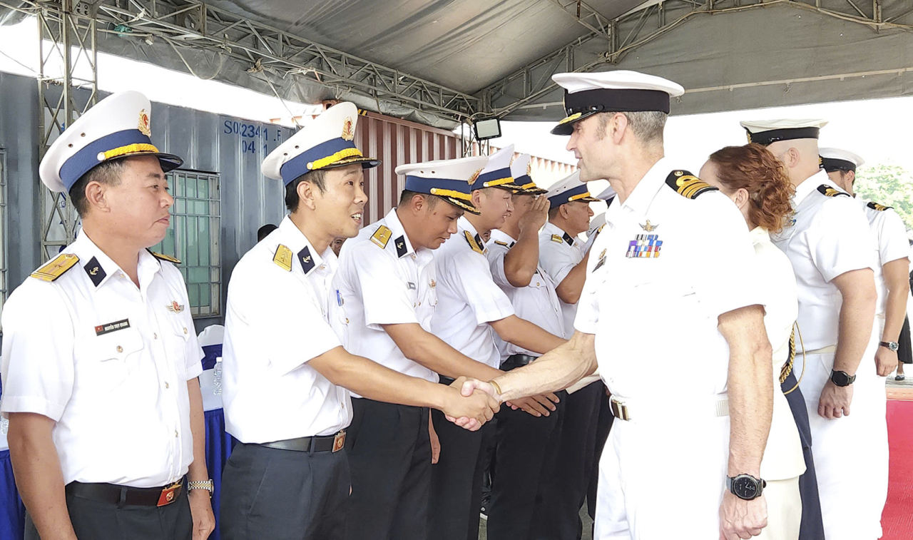 Cán bộ, sĩ quan Hải quân Việt Nam đón Trung tá Robert Welford cùng thủy thủ đoàn