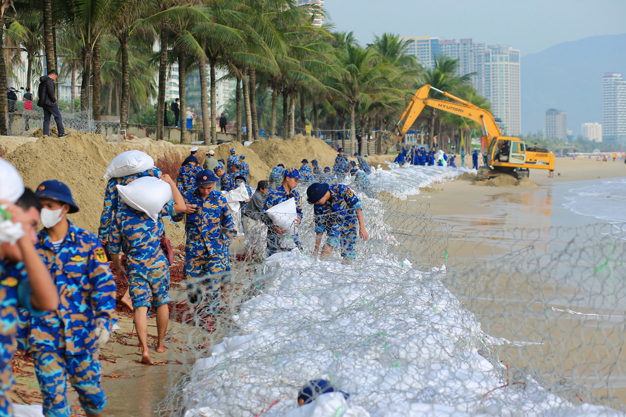 Đoàn viên thanh niên tham gia xây dựng kè chắn sóng khắc phục sạt lở tại bờ biển Mỹ Khê Đà Nẵng