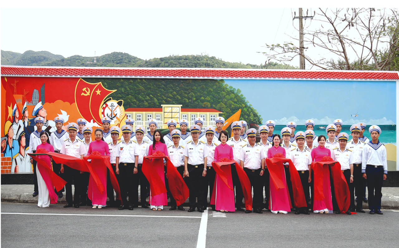 Cắt băng khánh thành bức tranh cổ động bằng chất liệu sơn dầu phía trước cổng chính của Lữ đoàn