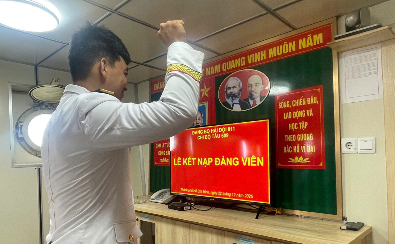 Đứng trước Đảng kỳ, đồng chí Nguyễn Văn Tiến đã dõng dạc tuyên thệ 4 lời thề của người đảng viên. Giọng nói vang lên giữa biển trời bao la như một lời hứa đanh thép của thế hệ trẻ Hải quân hôm nay: Tuyệt đối trung thành với mục tiêu lý tưởng của Đảng; không ngừng học tập, rèn luyện; sẵn sàng chiến đấu, hy sinh để bảo vệ vững chắc chủ quyền biển đảo, thềm lục địa thiêng liêng của Tổ quốc.