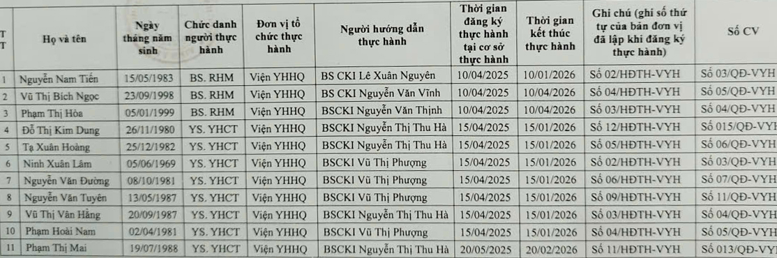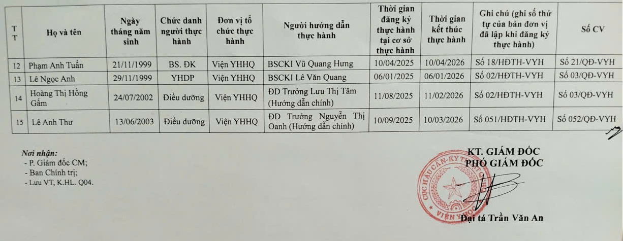 Căn cứ Nghị định số 96/2023/NĐ-CP ngày 30/12/2023 về quy định chi tiết một số điều của Luật Khám bệnh, chữa bệnh; Nghị định số 16/2024/NĐ/CP ngày 16/2/2024 về người hành nghề khám bệnh, chữa bệnh và cơ sở khám bệnh, chữa bệnh thuộc lực lượng vũ trang nhân dân; Viện Y học Hải quân lập danh sách và thông báo học viên thực hành khám, chữa bệnh tại bệnh viện như sau: