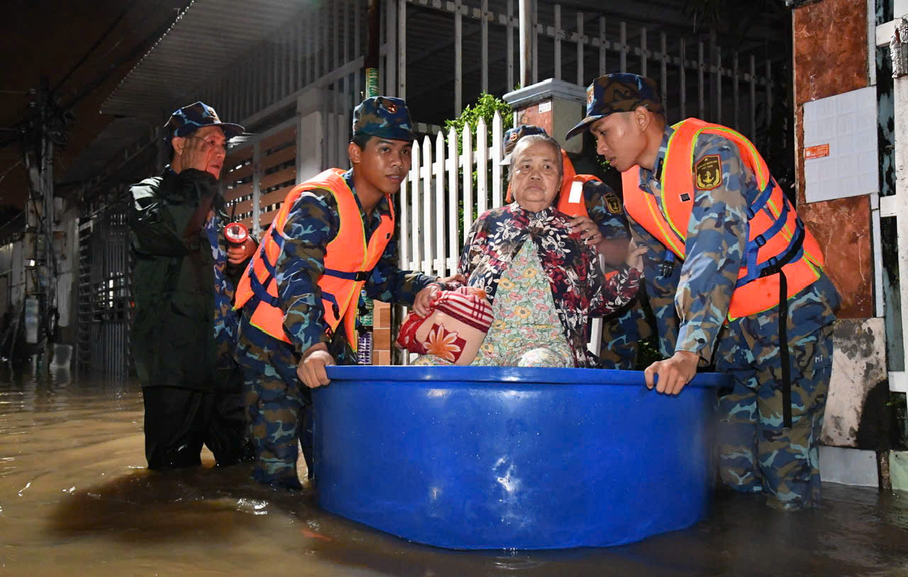 Cán bộ, chiến sĩ Lữ đoàn 681 hỗ trợ nhân dân di dời khỏi khu vực ngập sâu trên địa bàn