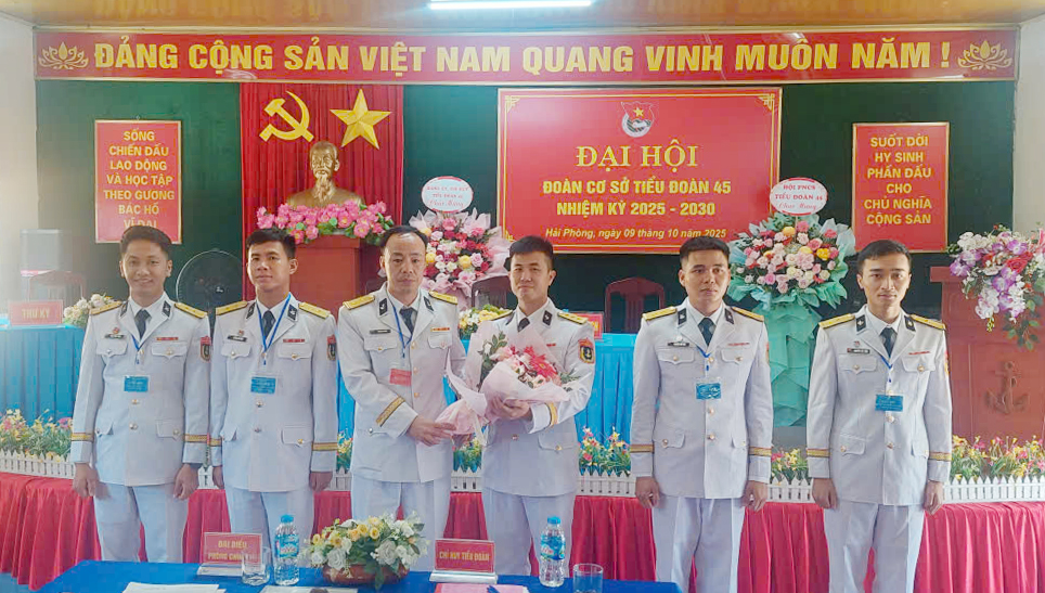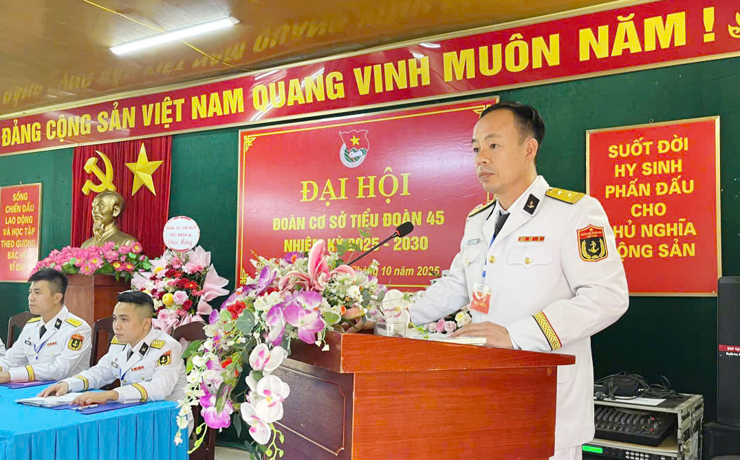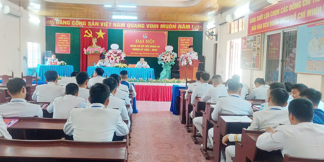 HQ Online - Ngày 9/10, tại Hải Phòng, Đoàn cơ sở Tiểu đoàn 45 (Cục Hậu cần – Kỹ thuật) Hải quân tổ chức Đại hội nhiệm kỳ 2025-2030. Trung tá Vũ Mạnh Chuẩn, Bí thư Đảng ủy, Chính trị viên Tiểu đoàn dự, chỉ đạo.