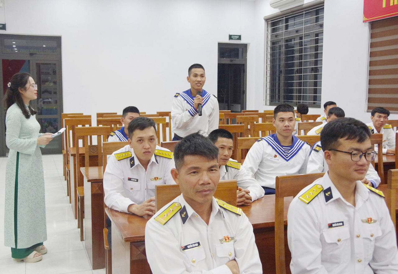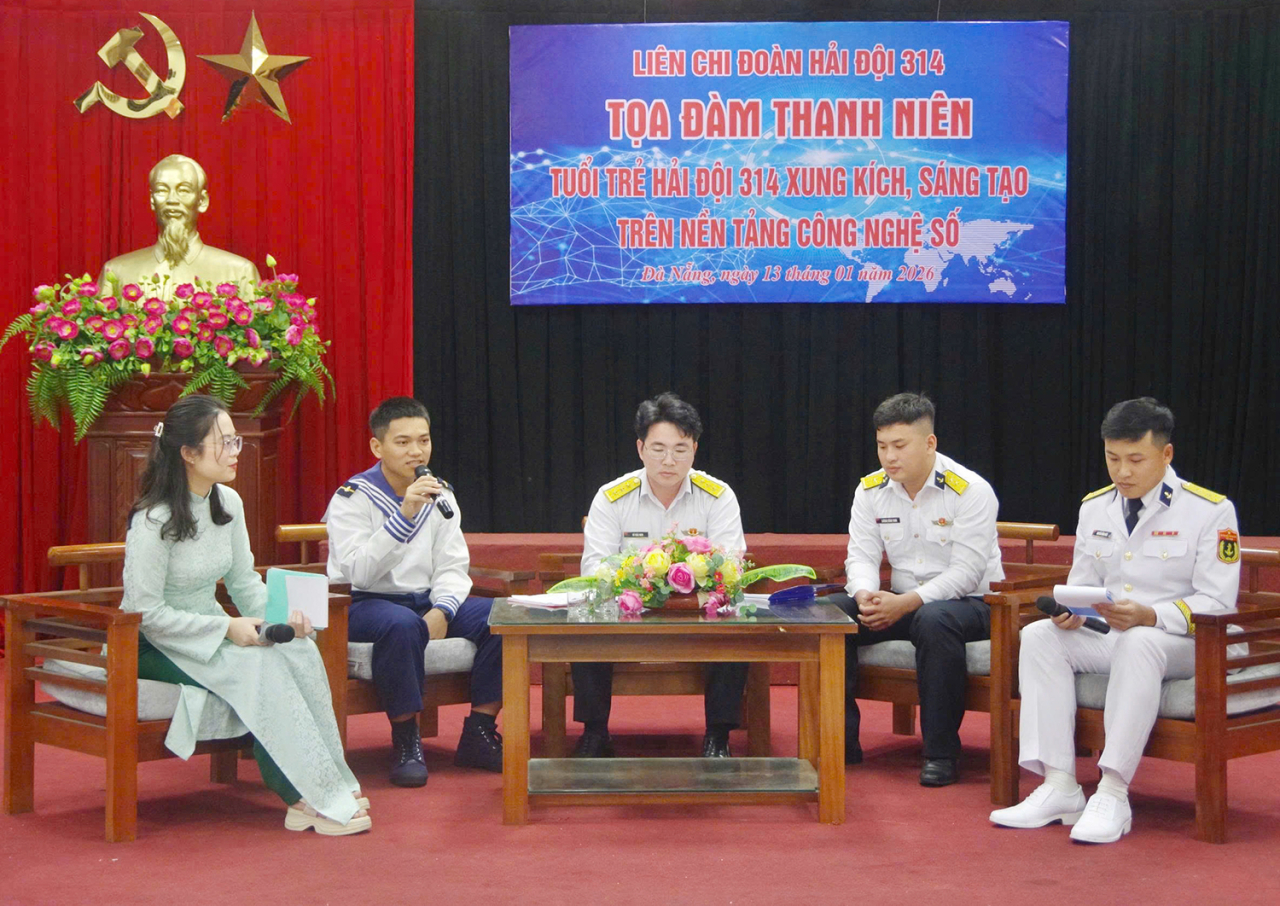 HQ Online - Tối 13/1, tại TP. Đà Nẵng, Đoàn cơ sở Lữ đoàn 161, Vùng 3 Hải quân tổ chức tọa đàm thanh niên với chủ đề “Tuổi trẻ Lữ đoàn 161 xung kích, sáng tạo trên nền tảng công nghệ số”. Thượng tá Nguyễn Công Khương, Phó Lữ đoàn trưởng dự, động viên.