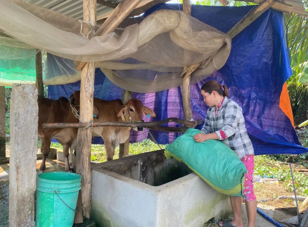 Chị Nguyễn Ngọc Chi (xã Thanh Phú Long, huyện Châu Thành) được hỗ trợ 2 con bò giống từ Chương trình mục tiêu Quốc gia giảm nghèo bền vững