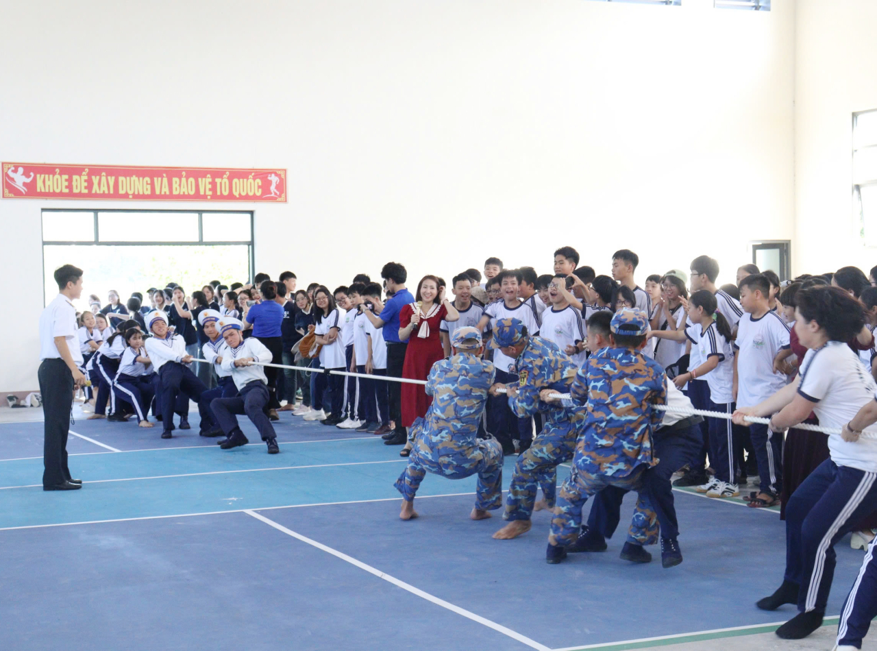Giáo viên, học sinh tham gia kéo co cùng cán bộ, chiến sĩ đơn vị