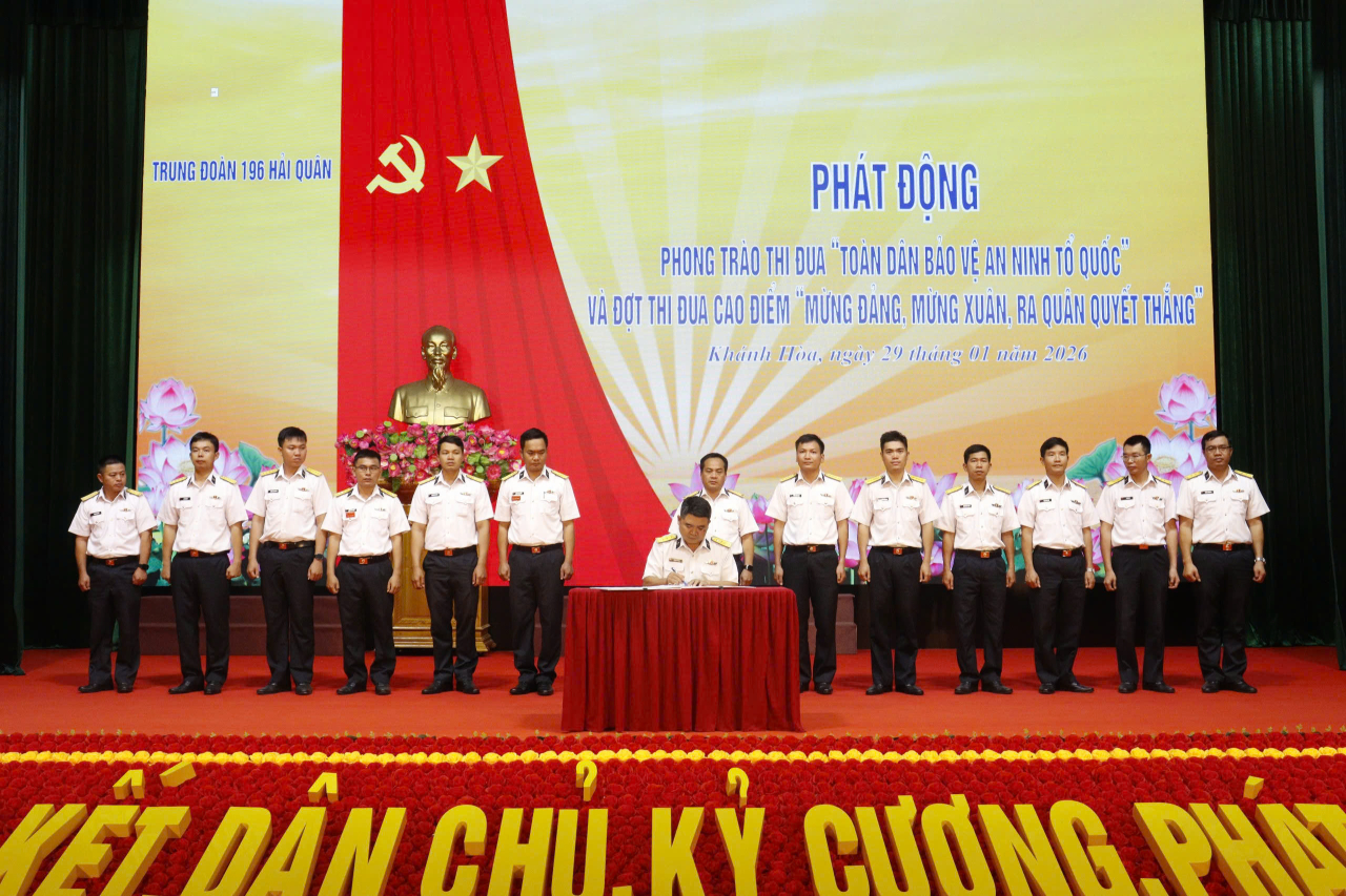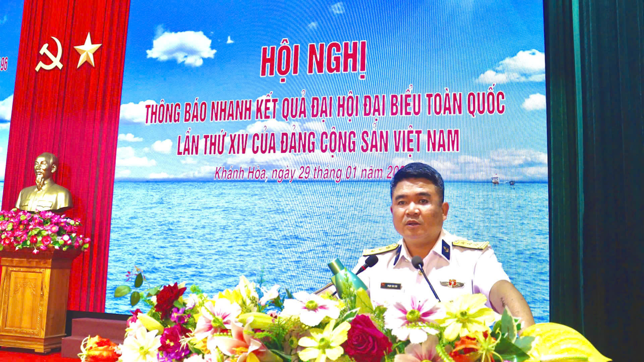 HQ Online - Sáng 29/1, tại phường Bắc Cam Ranh, tỉnh Khánh Hoà, Trung đoàn 196 Hải quân tổ chức thông báo nhanh kết quả Đại hội đại biểu toàn quốc lần thứ XIV của Đảng Cộng sản Việt Nam. Thượng tá Phạm Văn Sơn, Bí thư Đảng ủy, Chính ủy Trung đoàn chủ trì và trực tiếp thông báo nội dung.
