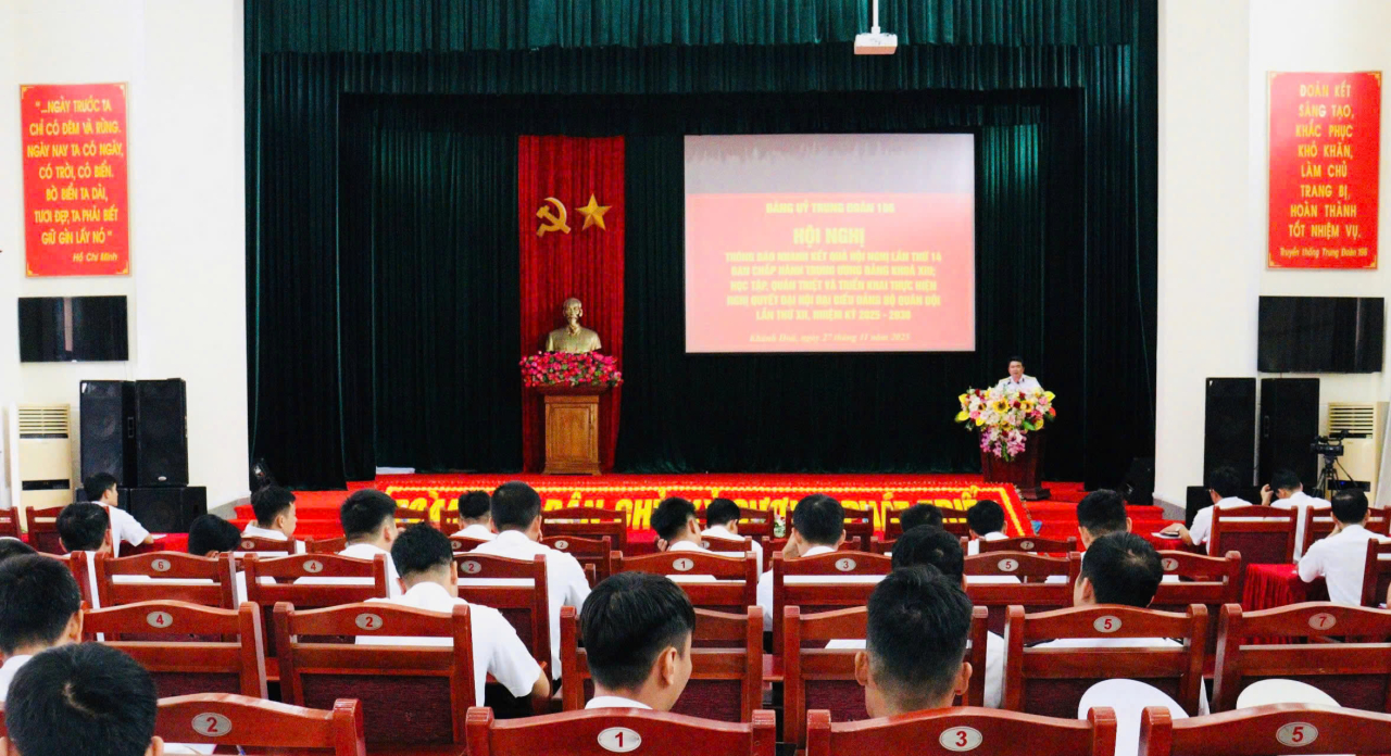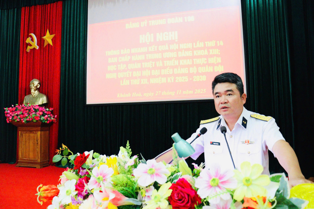 HQ Online - Sáng 27/11, tại Phường Bắc Cam Ranh, tỉnh Khánh Hoà, Trung đoàn 196 Hải quân tổ chức thông báo nhanh kết quả Hội nghị lần thứ 14 Ban Chấp hành Trung ương Đảng khóa XIII; học tập, quán triệt và triển khai thực hiện Nghị quyết Đại hội đại biểu Đảng bộ Quân đội lần thứ XII, nhiệm kỳ 2025 - 2030. Thượng tá Phạm Văn Sơn, Bí thư Đảng ủy, Chính ủy Trung đoàn chủ trì và trực tiếp thực hiện nội dung.