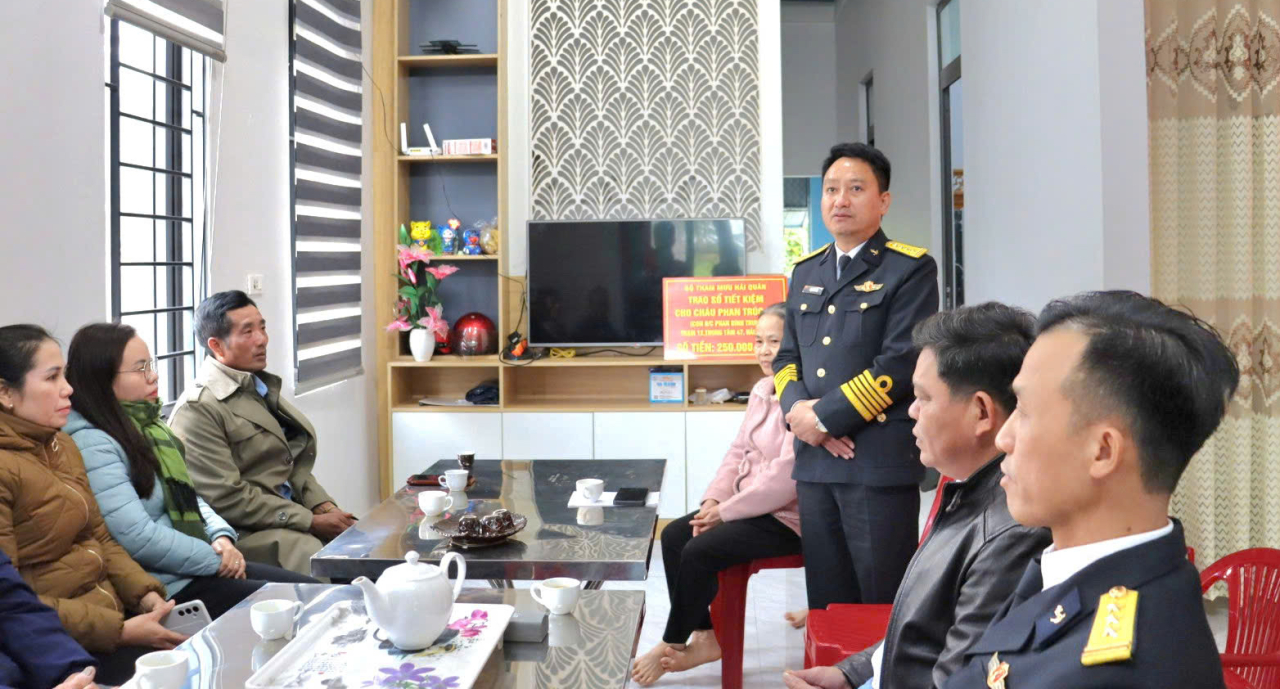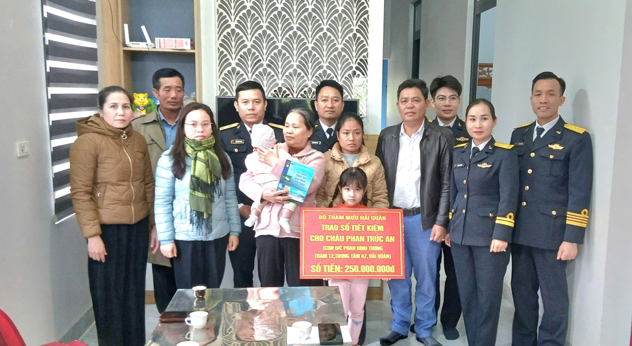 HQ Online - Chiều 8/1, tại thôn Cao Xuân, xã Trường Ninh, tỉnh Quảng Trị, Trung tâm 47 (Bộ Tham mưu Hải quân) tổ chức trao sổ tiết kiệm trị giá 250 triệu đồng và kinh phí đỡ đầu cho cháu Phan Trúc An là con Thiếu tá quân nhân chuyên nghiệp Phan Đình Trung, Đài trưởng, Trạm 12, Cụm 3, Trung tâm 47.