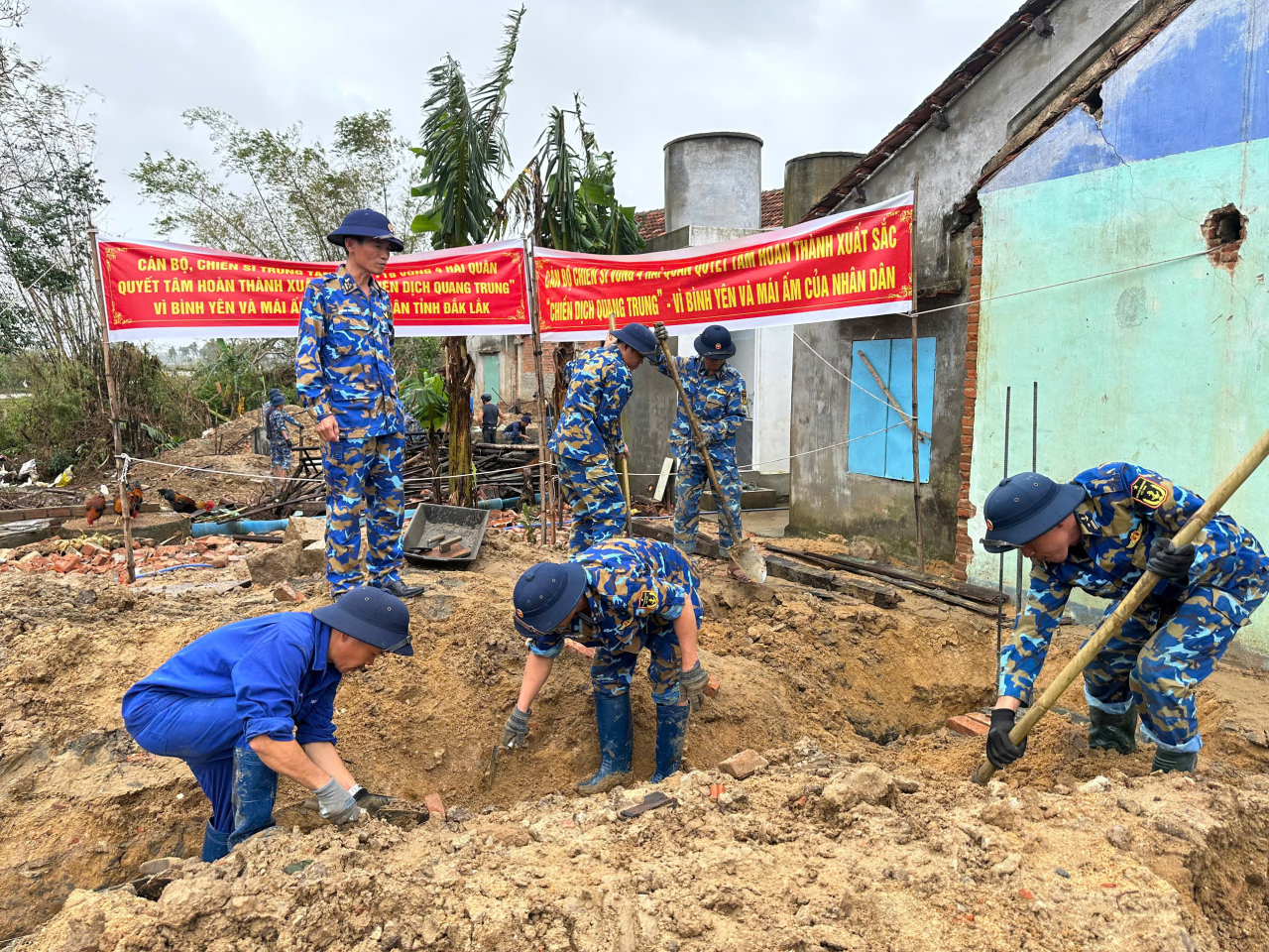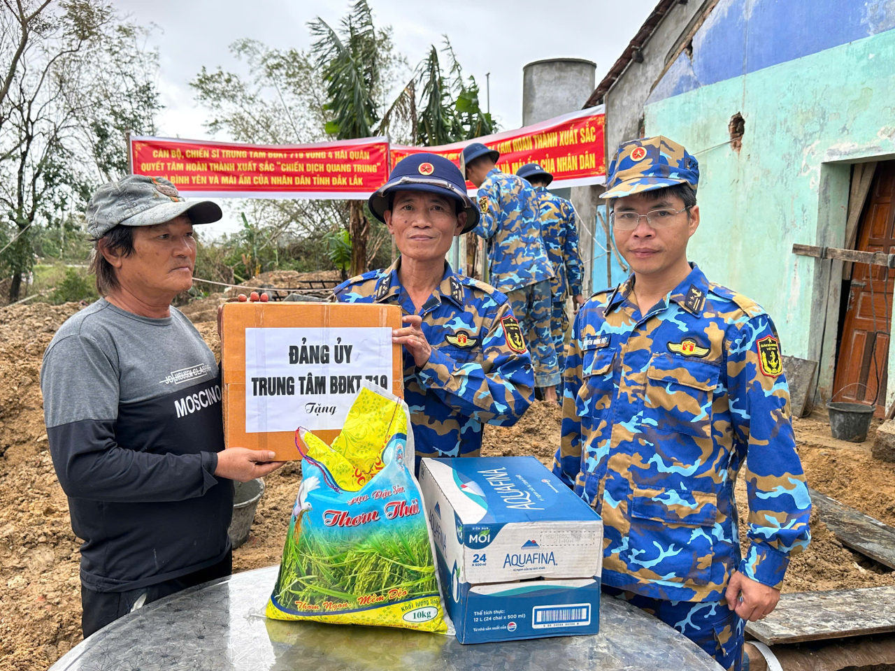 Thượng tá Hoàng Trần Lương gửi lời thăm hỏi tới các gia đình bị thiệt hại, động viên các lực lượng đang tham gia xây nhà giúp dân, đồng thời trao tặng nhu yếu phẩm, lương thực, nước uống, dụng cụ sinh hoạt cho cán bộ, chiến sĩ đang trực tiếp thực hiện nhiệm vụ.