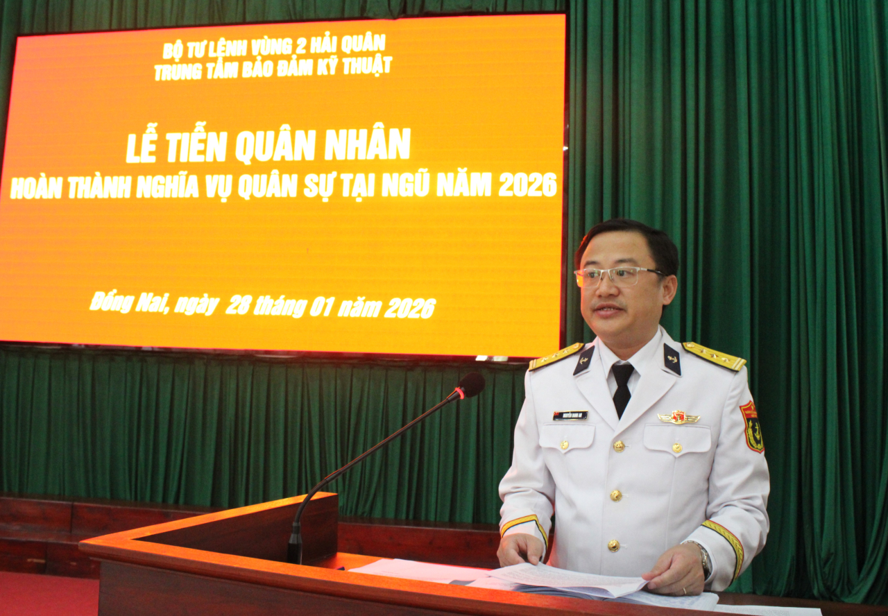 HQ Online - Sáng 28/1, tại xã Nhơn Trạch, tỉnh Đồng Nai, Trung tâm Bảo đảm kỹ thuật (BĐKT) Vùng 2 Hải quân tổ chức Lễ tiễn quân nhân hoàn thành nghĩa vụ quân sự năm 2026. Thượng tá Nguyễn Danh An, Phó Chỉ huy trưởng, Tham mưu trưởng Trung tâm dự và chỉ đạo.