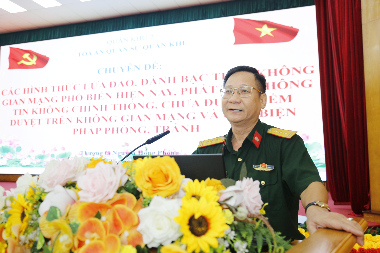 Tại buổi tuyên truyền, báo cáo viên của Tòa án Quân sự Quân khu 7 đã thông tin đến cán bộ, người lao động về chuyên đề các hình thức lừa đảo, đánh bạc phổ biến trên mạng internet hiện nay và biện pháp phòng, tránh; các vụ việc nghiêm trọng đã xảy ra trong thời gian qua…