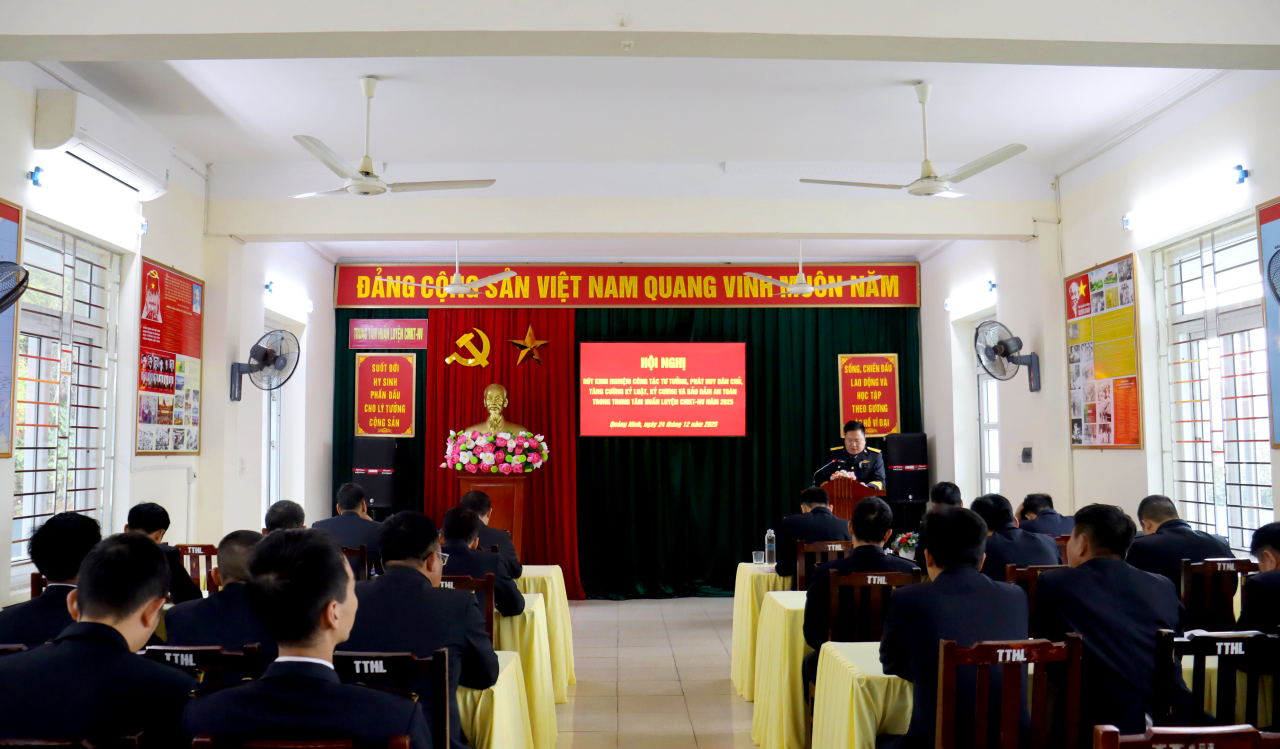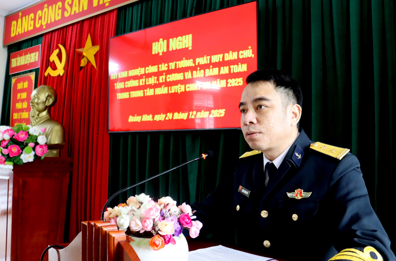 HQ Online - Sáng 24/12, tại Quảng Ninh, Trung tâm Huấn luyện Vùng 1 Hải quân tổ chức Hội nghị rút kinh nghiệm công tác tư tưởng, phát huy dân chủ, tăng cường kỷ luật, kỷ cương và bảo đảm an toàn. Trung tá Quách Minh Phú, Bí thư Đảng ủy, Chính trị viên Trung tâm chủ trì.