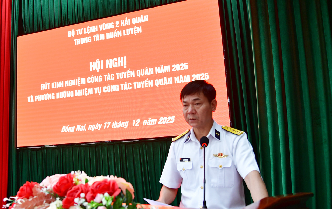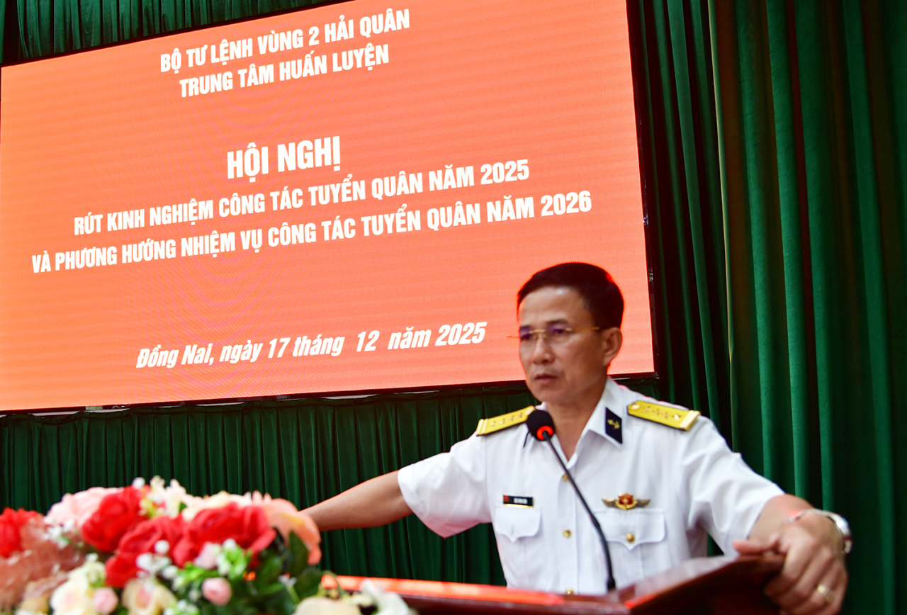 HQ Online - Ngày 17/12, tại xã Nhơn Trạch (tỉnh Đồng Nai), Trung tâm Huấn luyện, Vùng 2 Hải quân tổ chức Hội nghị rút kinh nghiệm công tác tuyển quân năm 2025. Đại tá Lê Đình Nghi, Phó Tham mưu trưởng Vùng 2 dự và phát biểu chỉ đạo. Đại tá Đậu Đình Dân, Chỉ huy trưởng Trung tâm chủ trì hội nghị.