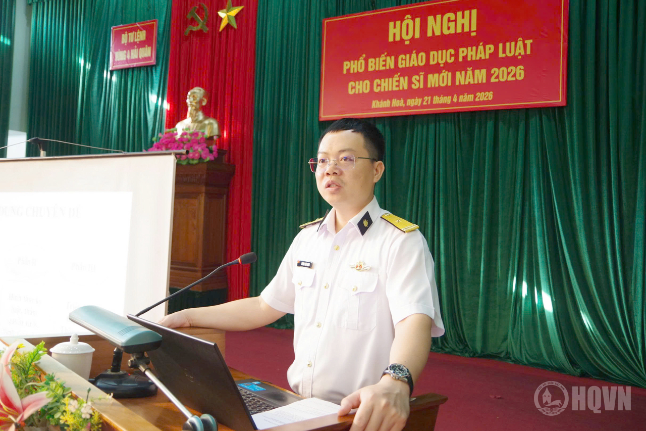 HQ Online - Ngày 21/4, tại phường Bắc Cam Ranh, tỉnh Khánh Hoà, Trung tâm Huấn luyện Vùng 4 Hải quân phối hợp với Tòa án quân sự khu vực Quân chủng Hải quân tổ chức phổ biến, giáo dục pháp luật cho chiến sĩ mới năm 2026.