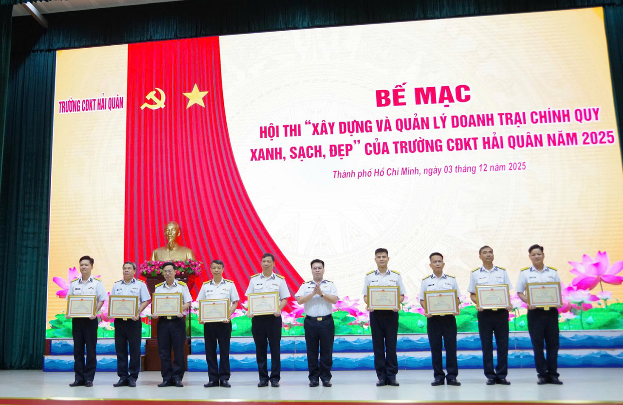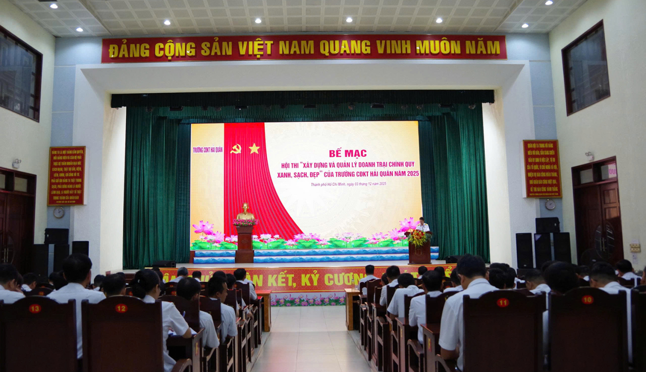 HQ Online - Chiều 3/12, tại TP. Hồ Chí Minh, Trường Cao đẳng Kỹ thuật Hải quân tổ chức bế mạc Hội thi “Xây dựng và quản lý doanh trại chính quy, xanh, sạch, đẹp” năm 2025. Dự bế mạc có Đại tá Đỗ Ngọc Hiểu, Hiệu trưởng; Đại tá Lương Đức Khanh, Chính ủy nhà trường; các đồng chí trong Đảng ủy, Ban Giám hiệu cùng lãnh đạo, chỉ huy các cơ quan, khoa, đơn vị trong toàn trường.