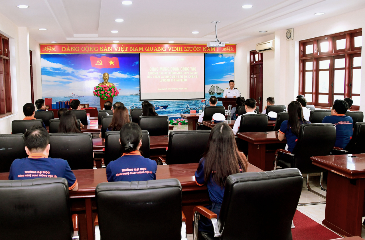 HQ Online - Chiều 21/3, tại phường Hà Tu, tỉnh Quảng Ninh, đoàn công tác của Trường Đại học Công nghệ Giao thông Vận tải do PGS, TS Nguyễn Hoàng Long, Hiệu trưởng làm trưởng đoàn đã đến thăm, nghiên cứu thực tế tại Lữ đoàn 170 (Vùng 1 Hải quân). Đại tá Vũ Hữu Kiêm, Phó Chính uỷ Vùng chủ trì đón tiếp đoàn.
