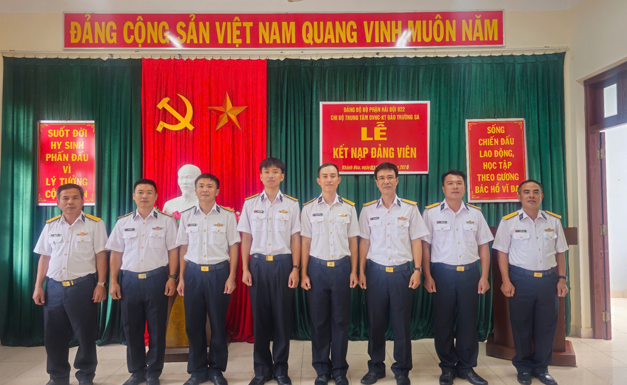 HQ Online - Sáng 3/2, nhân kỷ niệm 96 năm Ngày thành lập Đảng Cộng sản Việt Nam (3/2/1930 - 3/2/2026) và chào mừng thành công Đại hội đại biểu toàn quốc lần thứ XIV của Đảng, Chi bộ Trung tâm Dịch vụ Hậu cần - Kỹ thuật đảo Trường Sa (đặc khu Trường Sa, tỉnh Khánh Hoà), Hải đội 922, Hải đoàn 129 Hải quân đã tổ chức lễ kết nạp đảng viên cho quần chúng ưu tú.