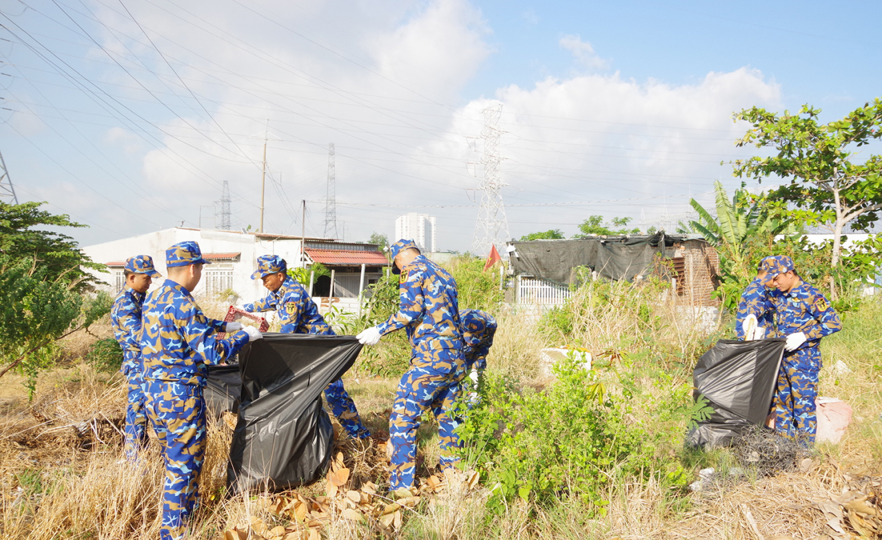 HQ Online - Sáng 4/4, hưởng ứng chương trình làm đẹp cảnh quan, môi trường của UBND phường Phước Thắng (TP. Hồ Chí Minh), hơn 20 cán bộ đoàn viên, thanh niên Hải đoàn 129 tham gia lao động vệ sinh môi trường, thu gom rác thải tại các tuyến đường, hẻm và khu vực công cộng.