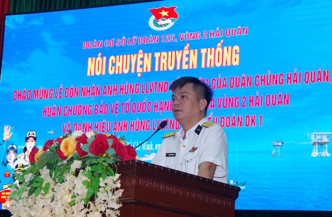 Trung tá Nguyễn Minh Dương tuyên truyền lịch sử ra đời, xây dựng, chiến đấu, trưởng thành của Tiểu đoàn DK1 và Vùng 2 Hải quân