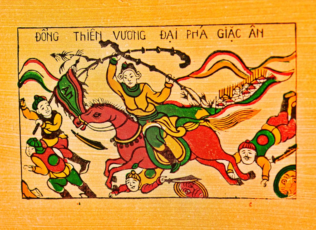 Đẹp nhất là con ngựa sắt mà Thánh Gióng cưỡi đi đánh giặc Ân, rồi lại cưỡi ngựa “bay về trời”, để lại nỗi ngẩn ngơ của người đời, rồi được chính người Kinh Bắc vẽ lại theo trí tưởng tượng và đọng lại trong bức tranh dân gian Đông Hồ. Cái đẹp của tranh ở chỗ dùng các gam màu sặc sỡ, toàn là những màu “gốc” lấy từ các sản phẩm tự nhiên quanh vùng: Đất son đỏ lấy từ vùng đồi thấp trong vùng, màu vàng từ hạt dành dành, màu đen từ than đốt từ lá tre, màu xanh từ gỉ đồng, cái nền tranh quét điệp lấp lánh lấy từ bột vỏ điệp từ biển... Cái gam màu sặc sỡ này là điểm nhấn như tín hiệu báo mùa xuân đã đến, nổi bật trên cái toàn cảnh của các màu chìm như màu nâu của mái rạ, tường đất, phên giậu, con đường làng hay màu xanh của các rặng tre đầu làng, màu nâu đỏ của mái đình, mái chùa...