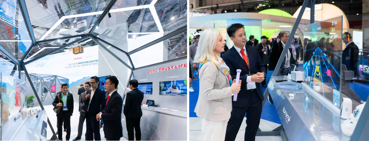 Khách tham quan trải nghiệm các giải pháp trong hệ sinh thái “Zero Trust Lifestyle” tại gian hàng Viettel ở MWC 2026. Các sản phẩm và dịch vụ được thiết kế nhằm bảo vệ người dùng trong toàn bộ hành trình số, từ xác thực danh tính, bảo vệ thiết bị đến bảo mật giao dịch và các ứng dụng trong đời sống số.