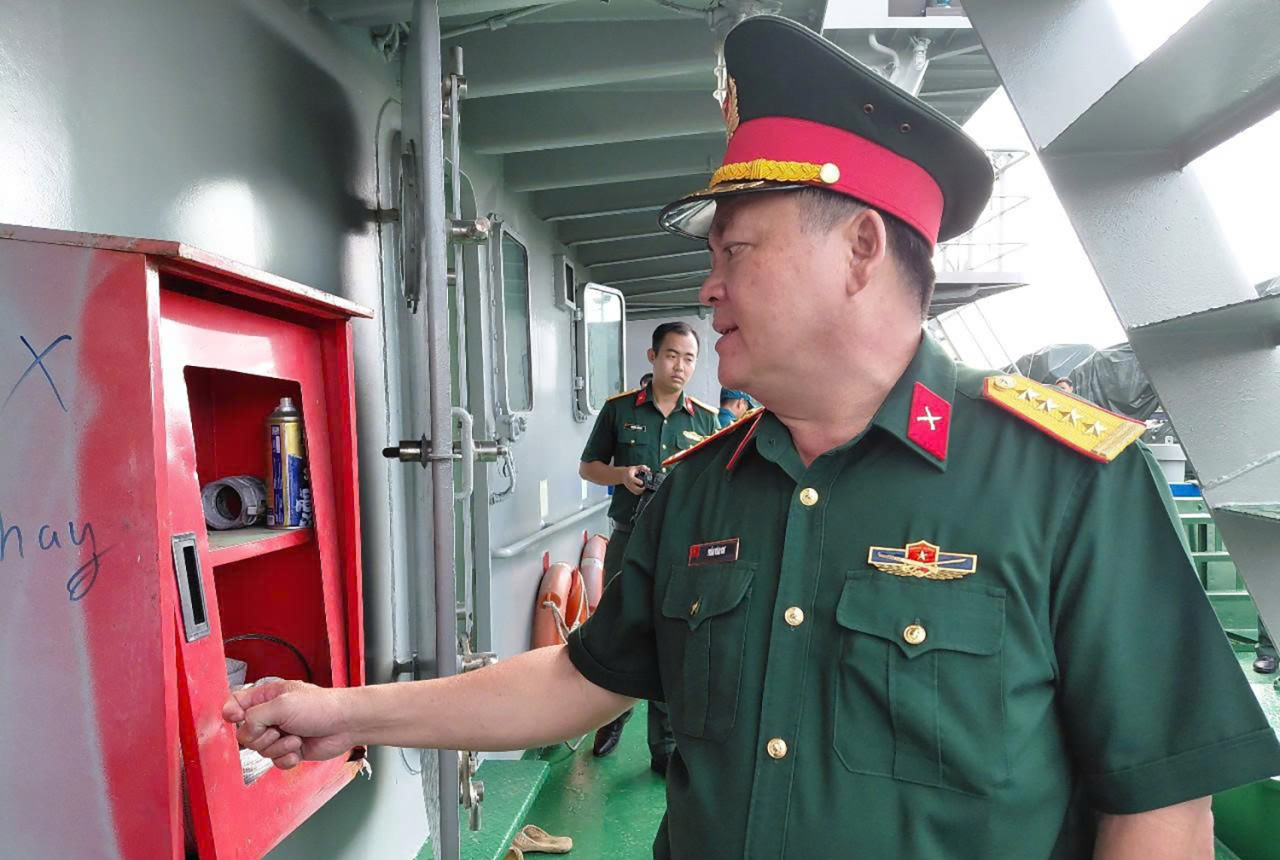 Đại tá Trần Văn Cư kiểm tra hệ thống chữa cháy trên tàu