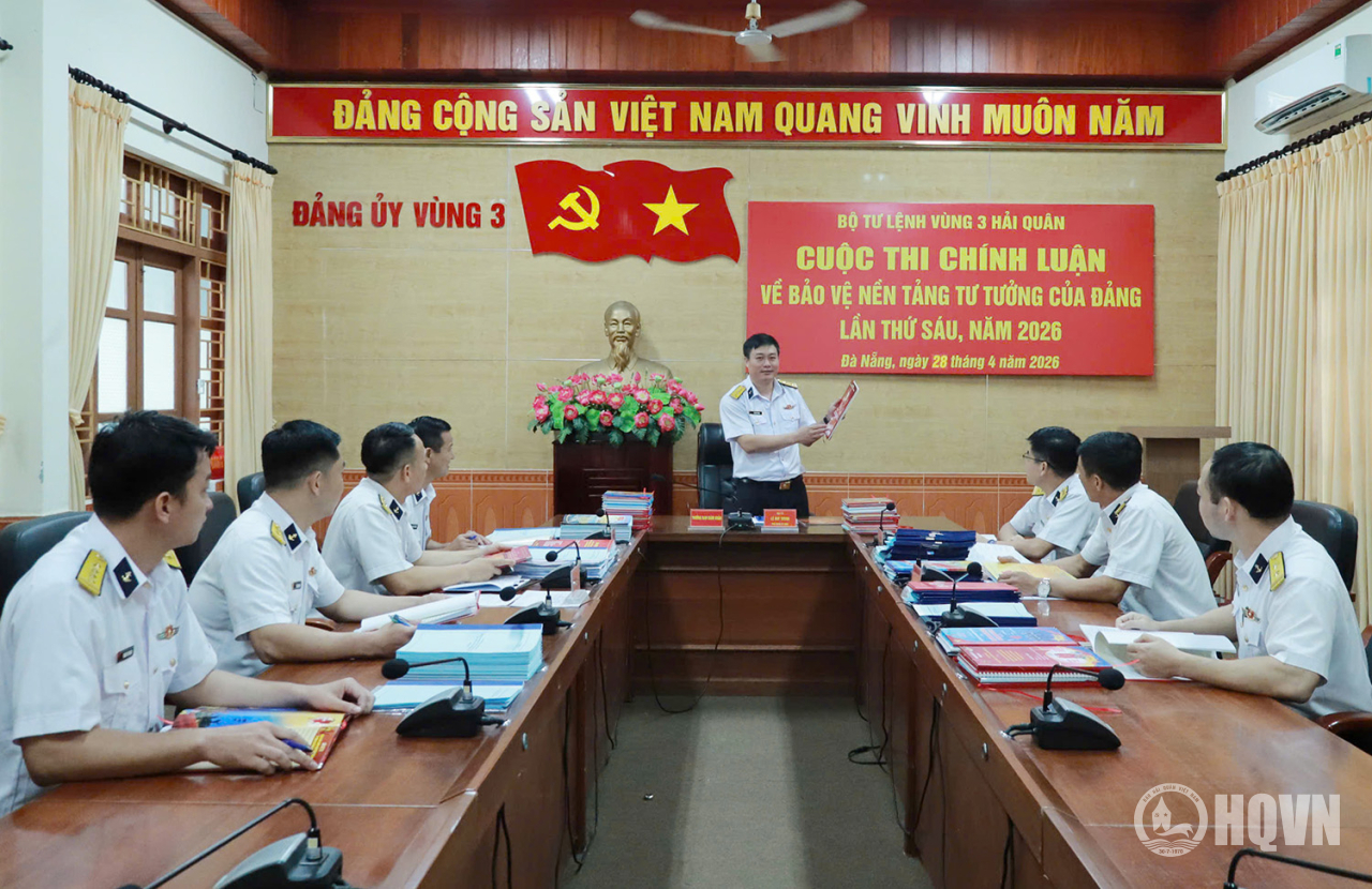 HQ Online - Sáng 28/4, tại TP. Đà Nẵng, Vùng 3 Hải quân tổ chức chấm các tác phẩm tham gia cuộc thi chính luận về bảo vệ nền tảng tư tưởng của Đảng lần thứ sáu, năm 2026. Đại tá Lê Huy Tuynh, Phó Chính ủy Vùng dự và chỉ đạo.