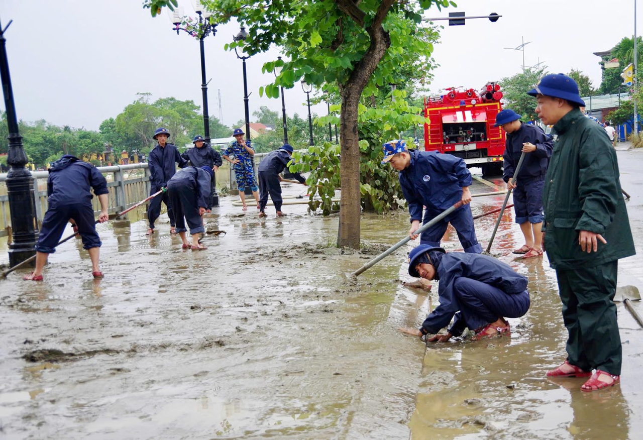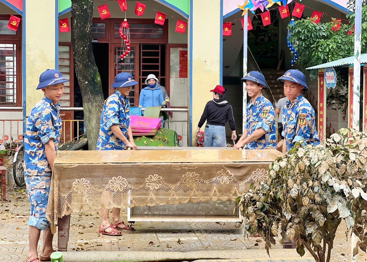 Cán bộ, chiến sĩ đã tập trung tổng dọn vệ sinh, thu gom rác thải, phun thuốc khử khuẩn ở các trụ sở UBND các xã, phường, bệnh xá, điểm trường và gia đình chính sách, người già neo đơn, để người dân sớm ổn định đời sống sinh hoạt và giúp các trường đón học sinh trở lại.
