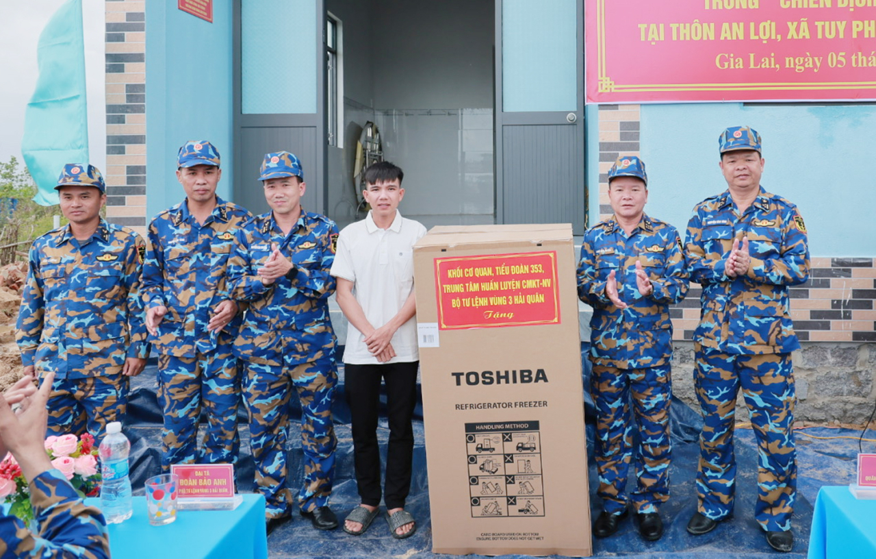 Dịp này, Bộ Tư lệnh Vùng 3 Hải quân và các đơn vị thi công đã hỗ trợ, tặng các vật dụng thiết yếu như bếp từ, chăn, áo quần, tủ lạnh… cho gia đình anh Nguyễn Văn Hiền. Các phần quà trị giá hơn 10 triệu đồng.