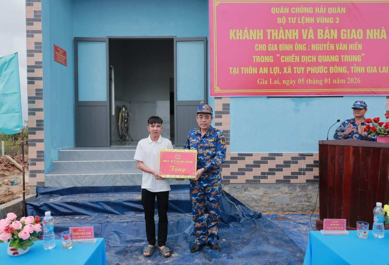 HQ Online - Ngày 5/1, tại tỉnh Gia Lai, Bộ Tư lệnh Vùng 3 Hải quân tổ chức khánh thành và bàn giao ngôi nhà thứ 4 cho nhân dân bị thiệt hại do bão lũ tại xã Tuy Phước Đông, tỉnh Gia Lai. Đại tá Đoàn Bảo Anh, Phó Tư lệnh Vùng dự và chủ trì.