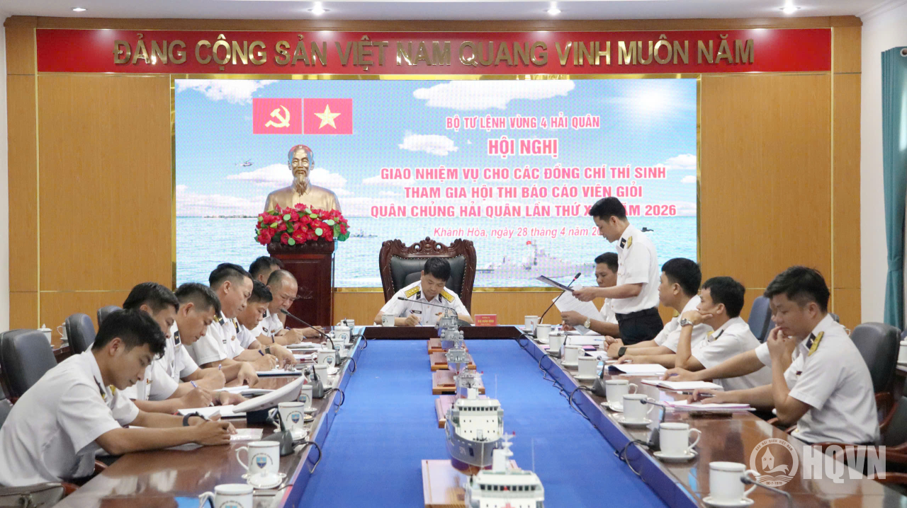 HQ Online - Chiều 28/4, tại phường Bắc Cam Ranh, tỉnh Khánh Hòa, Bộ Tư lệnh Vùng 4 Hải quân tổ chức Hội nghị quán triệt, giao nhiệm vụ cho cán bộ tham gia Hội thi báo cáo viên giỏi Quân chủng Hải quân lần thứ XI năm 2026. Thượng tá Bùi Xuân Bình, Bí thư Đảng uỷ, Chính uỷ Vùng chủ trì.