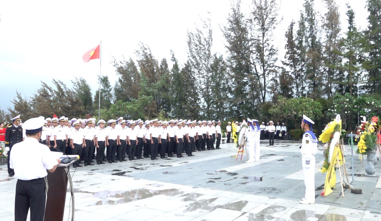 Trong không khí trang nghiêm, xúc động, đoàn công tác đã thành kính dâng hoa, dâng hương, dành phút mặc niệm tưởng nhớ và bày tỏ lòng biết ơn vô hạn đối với sự hy sinh anh dũng của cán bộ, chiến sĩ Hải quân nhân dân Việt Nam.