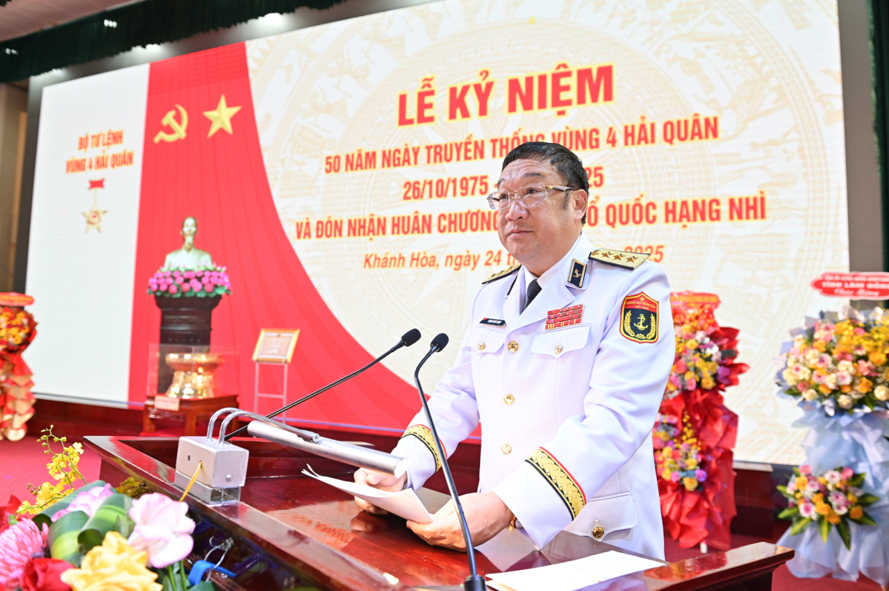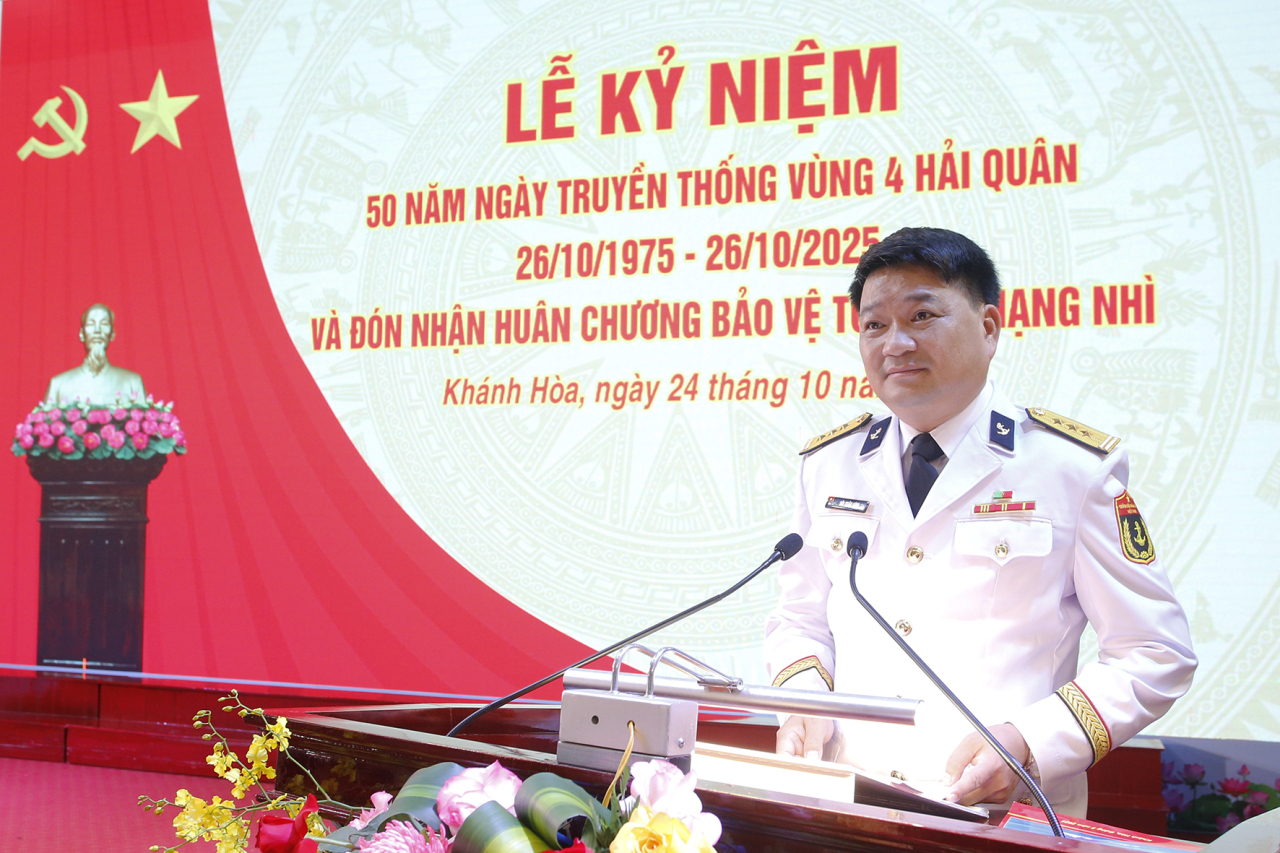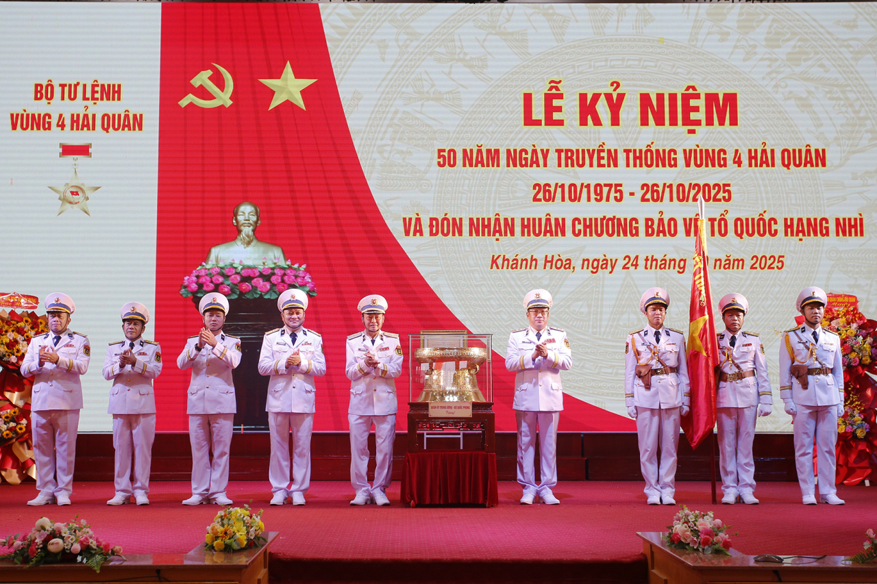 HQ Online - Sáng 24/10, tại phường Bắc Cam Ranh, tỉnh Khánh Hoà, Vùng 4 Hải quân long trọng tổ chức Lễ kỷ niệm 50 năm Ngày truyền thống (26/10/1975 - 26/10/2025) và đón nhận Huân chương Bảo vệ Tổ quốc hạng Nhì. Dự lễ có Thượng tướng Phạm Hoài Nam, Uỷ viên Trung ương Đảng, Thứ trưởng Bộ Quốc phòng; đồng chí Nguyễn Thị Tuyến, Uỷ viên Trung ương Đảng, Phó Chủ tịch UBTW Mặt trận Tổ quốc Việt Nam, Chủ tịch Hội Liên hiệp Phụ nữ Việt Nam; Chuẩn Đô đốc Nguyễn Văn Bách, Phó Tư lệnh, Tham mưu trưởng Hải quân.