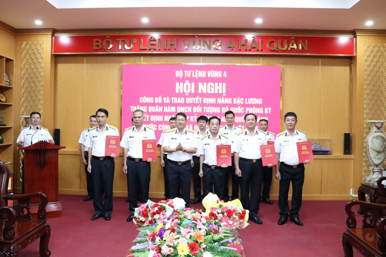 HQ Online - Chiều 14/10, tại phường Bắc Cam Ranh, tỉnh Khánh Hòa, Đảng ủy, Bộ Tư lệnh Vùng 4 Hải quân tổ chức Hội nghị công bố và trao quyết định nâng bậc lương, thăng quân hàm cho các đồng chí quân nhân chuyên nghiệp dịp kỷ niệm 80 năm Quốc khánh nước Cộng hòa xã hội chủ nghĩa Việt Nam (2/9/1945 - 2/9/2025). Đại tá Bùi Quang Thuyên, Phó Tư lệnh Vùng 4 chủ trì.