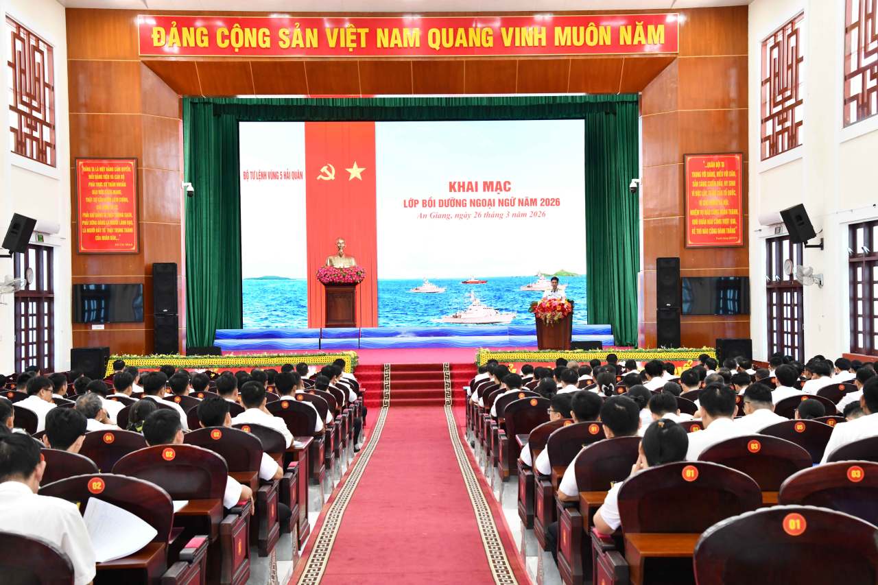 HQ Online - Chiều 26/3, tại đặc khu Phú Quốc, tỉnh An Giang, Bộ Tư lệnh Vùng 5 Hải quân tổ chức khai mạc lớp bồi dưỡng ngoại ngữ năm 2026 cho sĩ quan, quân nhân chuyên nghiệp. Đại tá Mai Đăng Danh, Phó Tư lệnh, Tham mưu trưởng Vùng dự và chỉ đạo.