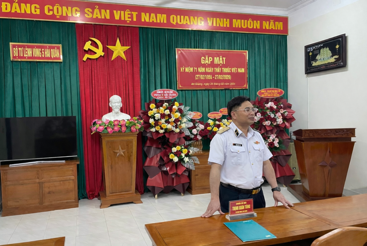 HQ Online - Sáng 26/2, tại đặc khu Phú Quốc, tỉnh An Giang, Bộ Tư lệnh Vùng 5 Hải quân tổ chức gặp mặt kỷ niệm 71 năm Ngày Thầy thuốc Việt Nam (27/2/1955-27/2/2026). Chuẩn Đô đốc Trịnh Xuân Tùng, Tư lệnh Vùng dự và chỉ đạo.