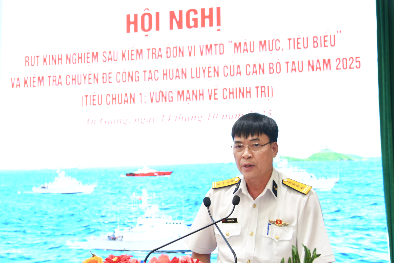 HQ Online - Chiều 14/10, tại đặc khu Phú Quốc, tỉnh An Giang, Bộ Tư lệnh Vùng 5 Hải quân tổ chức Hội nghị rút kinh nghiệm sau kiểm tra đơn vị vững mạnh toàn diện (VMTD) “mẫu mực, tiêu biểu” và kiểm tra chuyên đề công tác huấn luyện cán bộ tàu năm 2025. Chuẩn Đô đốc Ngô Văn Thành, Bí thư Đảng ủy, Chính ủy Vùng dự và chỉ đạo.
