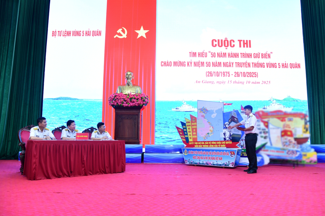 HQ Online - Nằm trong chuỗi các hoạt động chào mừng kỷ niệm 50 năm Ngày thành lập Vùng 5 Hải quân (26/10/1975 – 26/10/2025), ngày 15/10, tại đặc khu Phú Quốc, tỉnh An Giang, Bộ Tư lệnh Vùng 5 Hải quân tổ chức chấm bài dự thi tìm hiểu “50 năm hành trình giữ biển”. Đại tá Hoàng Quốc Hoàn, Phó Chính ủy Vùng, dự và chỉ đạo.
