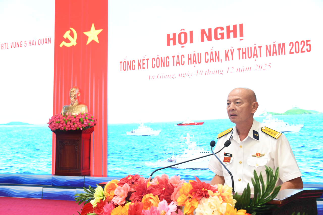 HQ Online - Sáng 10/12, tại đặc khu Phú Quốc, tỉnh An Giang, Bộ Tư lệnh Vùng 5 Hải quân tổ chức Hội nghị tổng kết công tác hậu cần, kỹ thuật năm 2025. Chuẩn Đô đốc Ngô Văn Thành, Bí thư Đảng ủy, Chính ủy Vùng dự và chỉ đạo. Cùng dự có Đại tá Mai Đăng Danh, Phó Tư lệnh, Tham mưu trưởng Vùng. Đại tá Lục Đức Tiên, Phó Tư lệnh Vùng chủ trì.