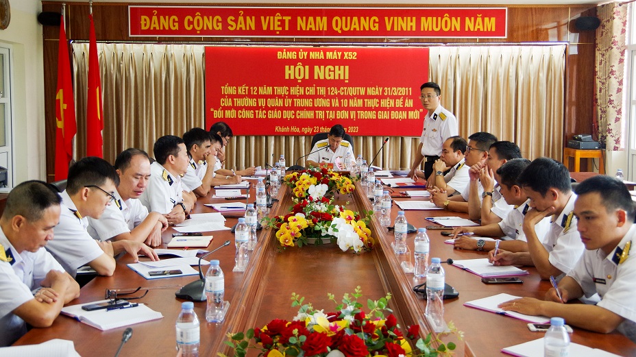 HQ Online - Sáng 23/3, tại TP. Cam Ranh, tỉnh Khánh Hòa, Đảng ủy Nhà máy X52, Cục Kỹ thuật Hải quân tổ chức Hội nghị tổng kết 12 năm thực hiện Chỉ thị 124-CT/QUTW ngày 31/3/2011 của Thường vụ Quân ủy Trung ương về tăng cường lãnh đạo, chỉ đạo công tác giáo dục chính trị tại đơn vị trong giai đoạn mới và 10 năm thực hiện Đề án “Đổi mới công tác giáo dục chính trị (GDCT) tại đơn vị trong giai đoạn mới”. Đại tá Phạm Bá Bằng, Bí thư Đảng ủy, Chính ủy Nhà máy chủ trì.